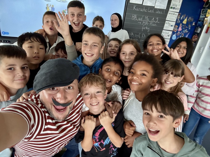 « Als wir in der 4. Klasse Herrn Bernard fragten, bei wem wir Französisch haben werden, antwortete er, dass ein Franzose kommen würde. In der ersten Französischlektion waren wir sehr erstaunt als Monsieur Moustache ins Klassenzimmer trat. Er trägt einen Schnauz, einen komischen Hut und ein gestreiftes Shirt und er spricht nur Französisch, weil er nur sehr schlecht Deutsch spricht. Wenn er spricht, erklärt er uns die Sachen mit Handzeichen und oft müssen wir raten, was er genau meint, manchmal kommt es auch zu Missverständnissen, aber das gehört dazu, wenn man eine neue Sprache lernt. Monsieur Moustache ist lustig und humorvoll und das Fach Französisch macht uns grossen Spass, weil wir immer wieder aufs Neue überrascht sind. Alle Kinder freuen sich auf die Französischlektionen mit Monsieur Moustache. Danke, dass wir so einen tollen Lehrer haben, so ist es viel spassiger.