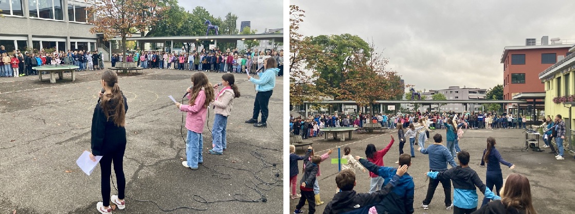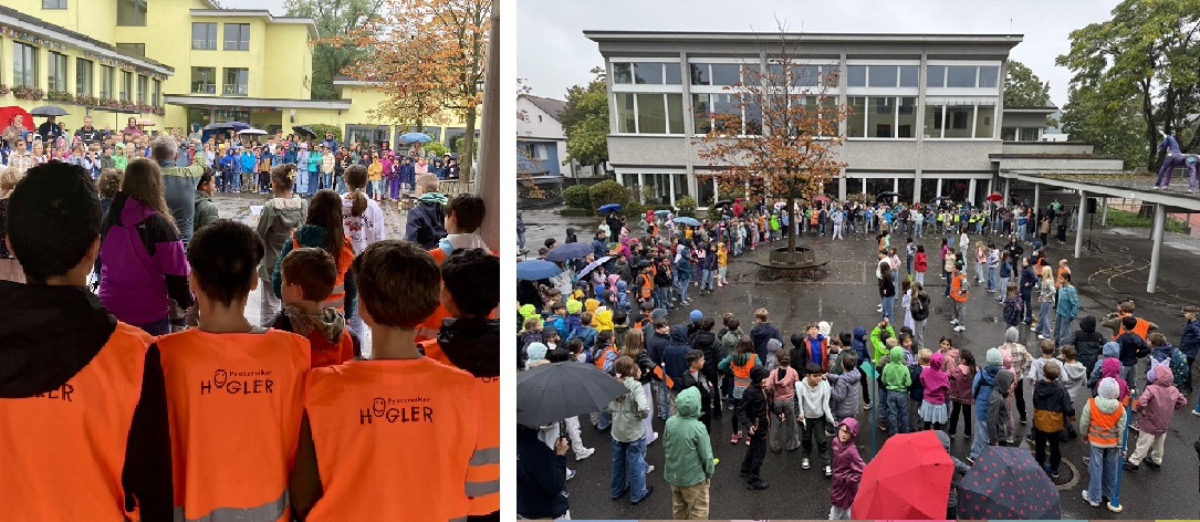 Ende September fanden im Schulhaus Högler die traditionsreichen Peacemakertage statt. Den Auftakt verbrachten alle Kinder gemeinsam auf dem Pausenplatz. Wir sangen das Högler-Lied, welches von Kindern aus der fünften Klasse musikalisch begleitet wurde. Zum Lied «Mier flüged los» von Remo Forrer sangen und tanzten die Kinder mit. Dabei erhielten sie Unterstützung von Schülerinnen und Schülern aus der 6. Klasse. Die Begrüssung war trotz des Regens ein voller Erfolg.