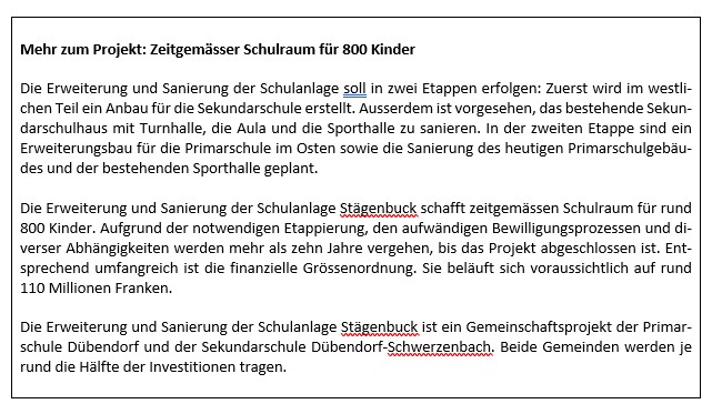 Die Schulanlage Stägenbuck in Dübendorf soll saniert und erweitert werden. Die Primarschulpflege und der Stadtrat Dübendorf sowie die Sekundarschulpflege Dübendorf-Schwerzenbach haben die Vorlage für einen Projektierungskredit über 7.2 Millionen Franken verabschiedet. Diese geht nun an das Dübendorfer Parlament. Nächstes Jahr ist eine Volksabstimmung vorgesehen.